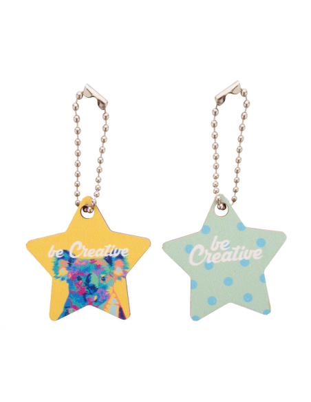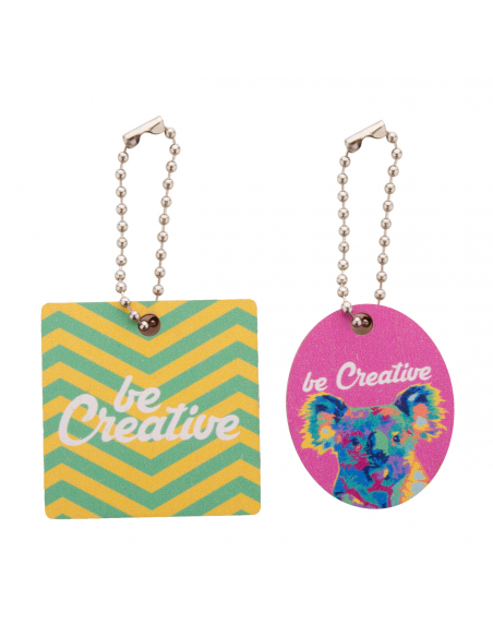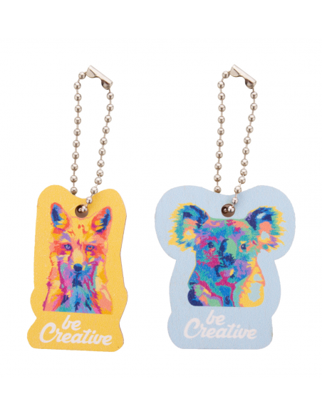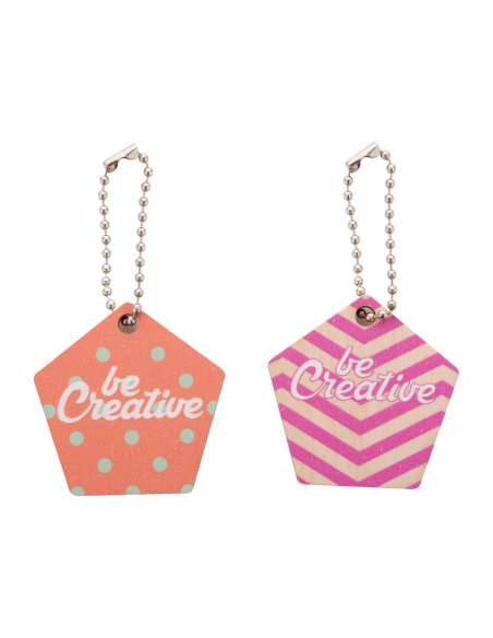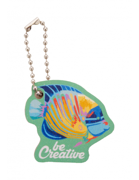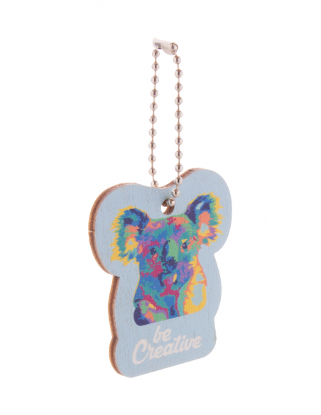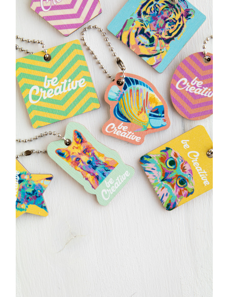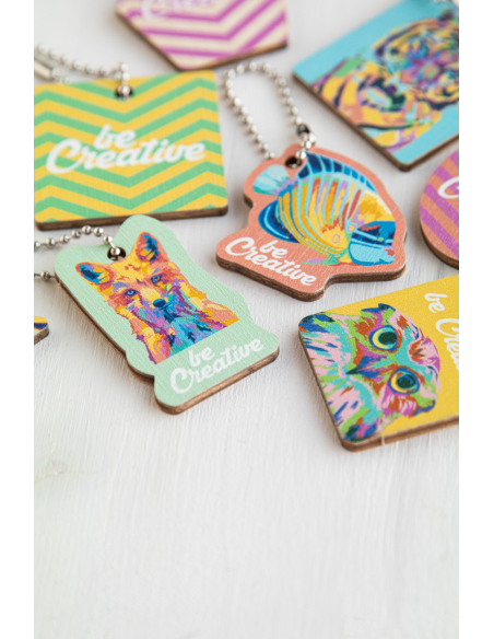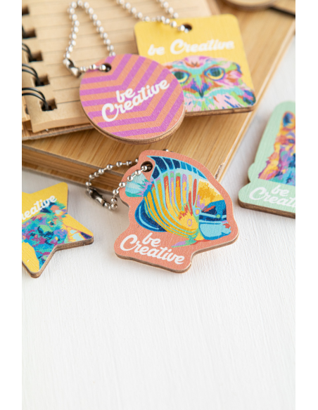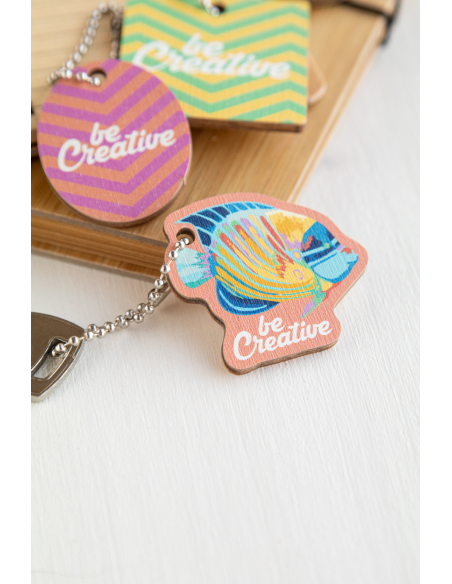 Custom made, birch plywood keyring with full-colour printing and metal chain. Produced in custom shape - maximum size: 45x45 mm. Price includes UV LED printing on one side. MOQ: 200 pcs.