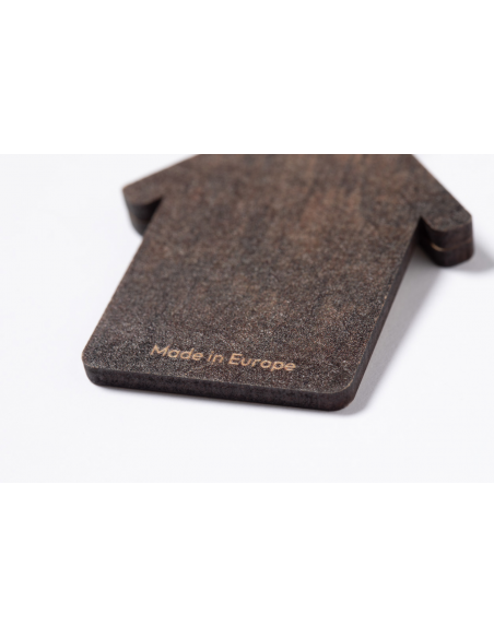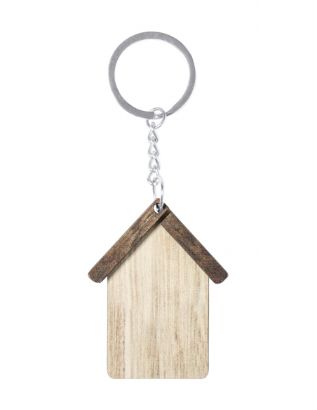 House-shaped wooden keyring with metal ring and two-tone finish.
