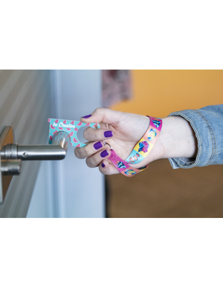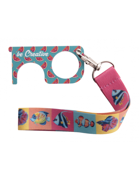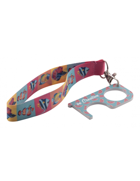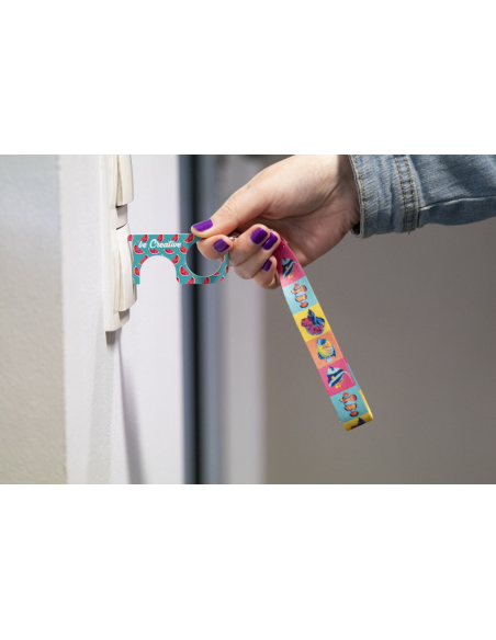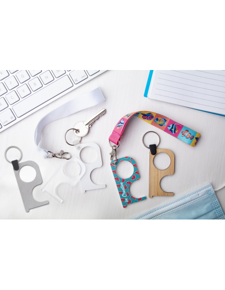 Practical hygiene key in acrylic for pushing buttons and opening doors without direct contact. Including polyester wristband with metal carabiner. With sublimation printed graphics on both sides of the ribbon. MOQ: 250 pcs.