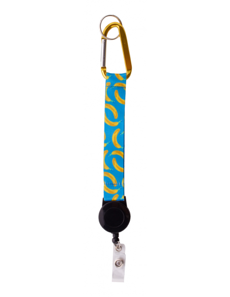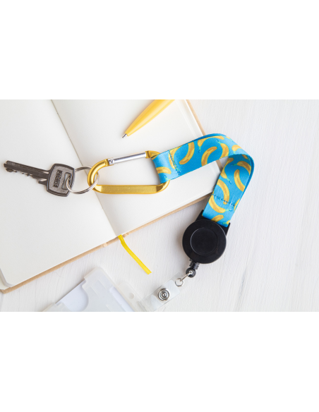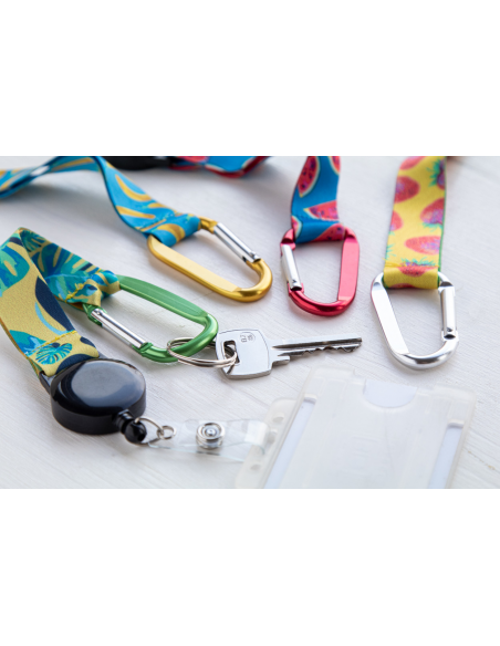 Custom made polyester keyring with sublimation printed graphics on both sides. With telescopic pass holder, aluminium carabiner and metal keyring. MOQ: 100 pcs.