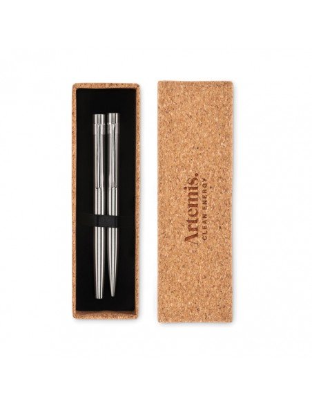 Recycled stainless steel pen set with ball pen and roller ball. Presented in matching cork box. Blue and black ink respectively.