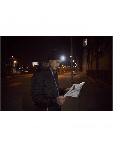 Dvisluoksnė megzta "beanie" kepurė. 100% akrilas. Nuimamas ir įkraunamas priekinis žibintas su trimis ryškumo nustatymais. Įkraunamas naudojant USB laidą.
