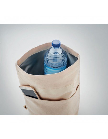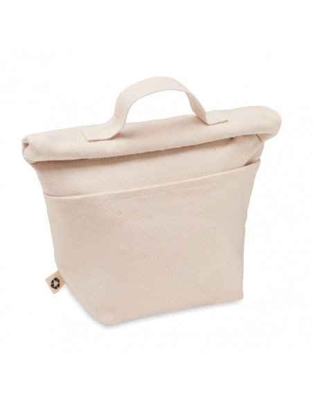 Recycled cotton (70% recycled cotton, 30% recycled polyester) insulated lunch cooler bag with rolltop hook and loop closure. Insulation: 3mm PE foam with 12C PEVA.