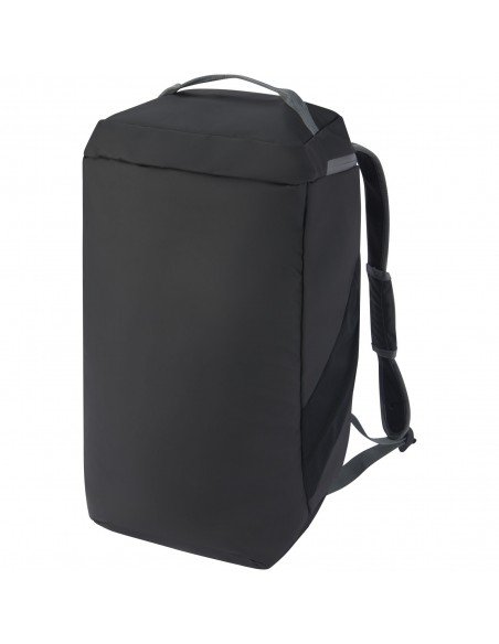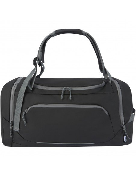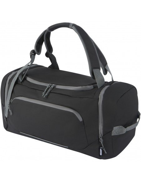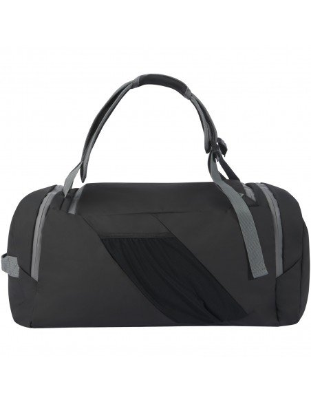 Water-resistant 2-in-1 duffel backpack made from GRS certified recycled materials, including the zips. It features a spacious main compartment with U-shaped opening for easy storage and access, two side zipped pockets (including a compartment for shoes), one zipped front pocket, a mesh water pocket on the back, and reflective piping for visibility. This bag can be carried in 3 different ways: By hand, over the shoulder, or as a backpack with its padded and adjustable shoulder straps. The GRS recycled materials include the main fabric, lining, webbing, and zips. Capacity: 35 litres. PVC free.