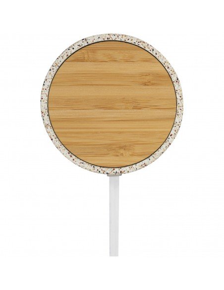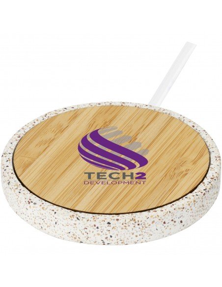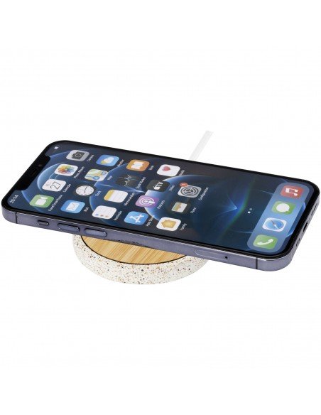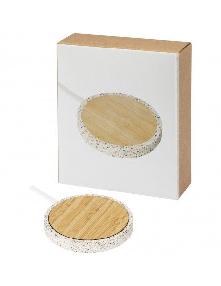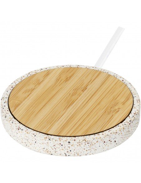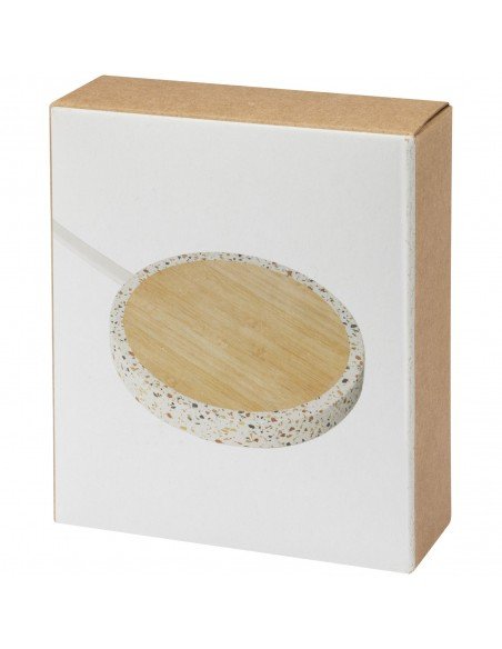 10W wireless charging pad made of a combination of natural terrazzo and bamboo. Built-in FOD safety feature to avoid risk of fire. Compatible with all Qi enabled devices (iPhone 8 or above and Android devices that support wireless charging). Delivered in a gift box with an instruction manual (both made of sustainable material).