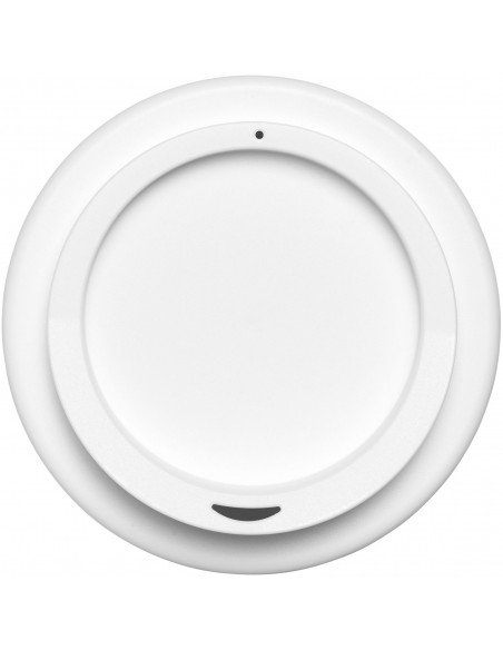Double-wall insulated tumbler with a twist-on lid and full colour wraparound design moulded to the product. Made from a total of 70% recycled material (recycled mug and black inner), and has a standard PP lid. The mug is fully recyclable, and dishwasher and microwave safe. 350 ml volume capacity and BPA free. Packed in a home compostable bag. Made in the UK.