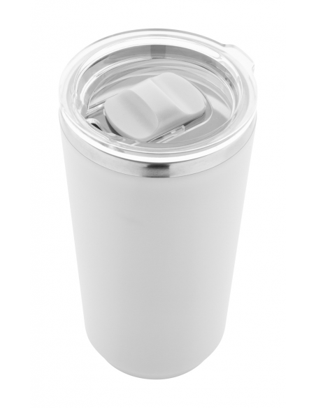430 ml insulated mug packed in white cardboard box. Inside wall is made from plastic. Shift-close lid. Hand wash only. It keeps temperature upwards 40 degrees Celsius for 3 hrs.