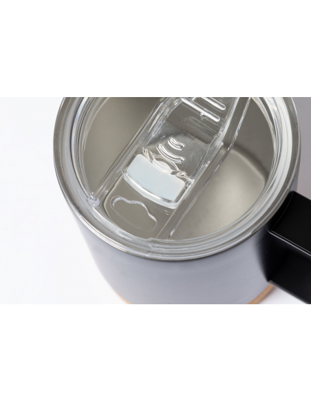 Double wall stainless steel thermo mug with drinking lid and natural cork base, 330 ml. In kraft paper box.