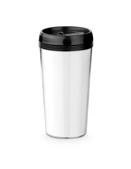 PP and PS travel cup with double body and lid with easy opening and closing system. Removable body for personalization of the interior. Capacity of 520 ml. Supplied in box