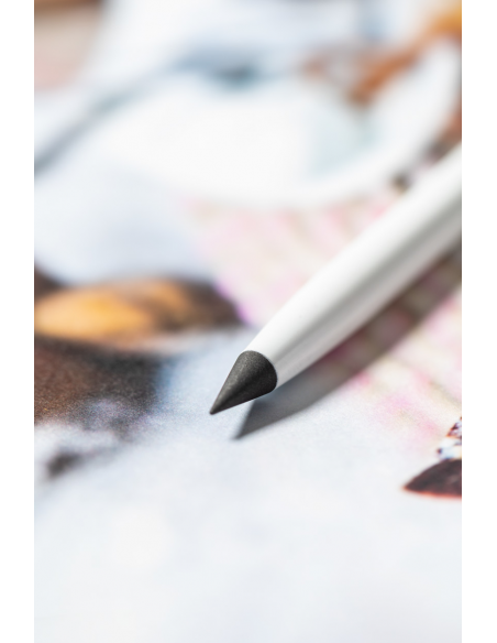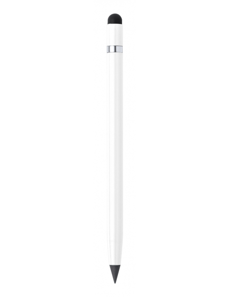 Long-lasting inkless aluminium pen with touch screen stylus and metal alloy tip, which oxidizes the paper. This pen writes similarly to a pencil and it is also erasable. Including eraser on the inside of the touch stylus.