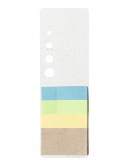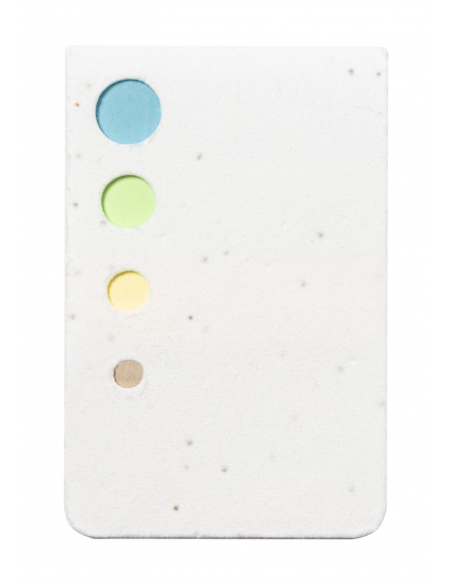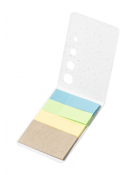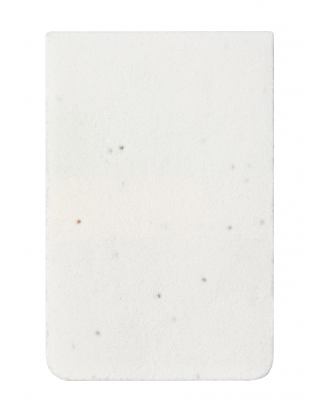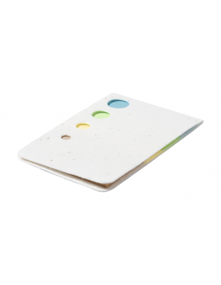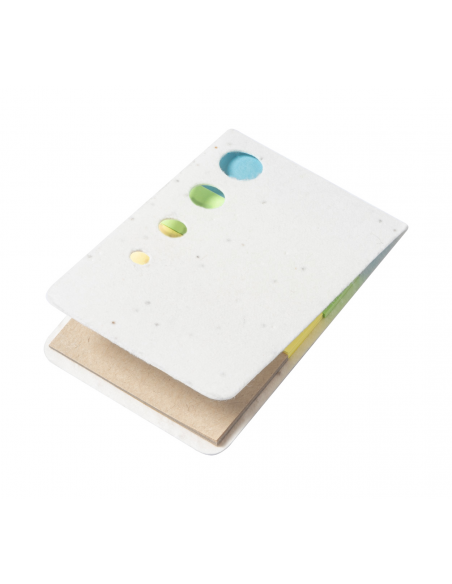 Seed paper covered recycled paper sticky notepad with 10 notes and 30 page markers (in 3 different colours). The seed paper cover contains petunia seeds in assorted colours, which can be planted by separating the cover from the notepad.