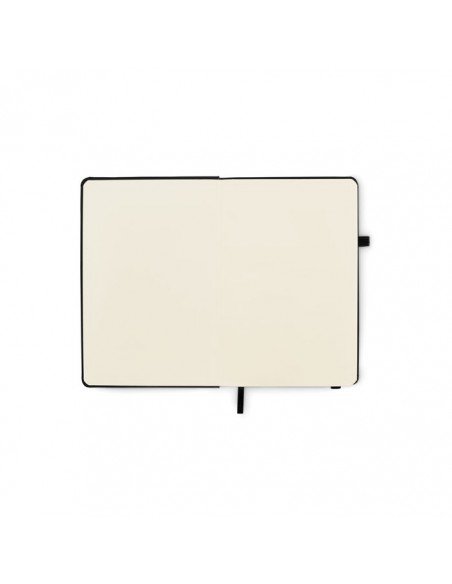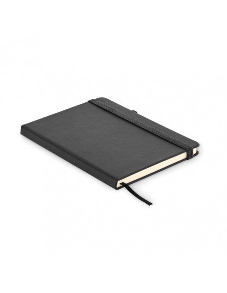 A5 notebook with recycled PU cover. Casebound. 192 recycled paper lined pages (96 sheets). Matching elastic closure strap and ribbon page-marker and pen holder.