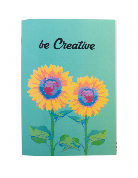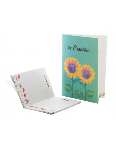 Custom made, recycled paper covered notebook with 32 recycled paper sheets, A5 size. Price includes full colour printed outside cover and an identical full colour print on all inside pages. MOQ: 100 pcs.