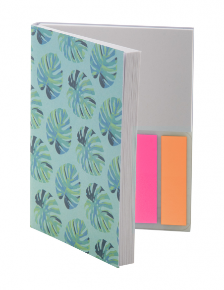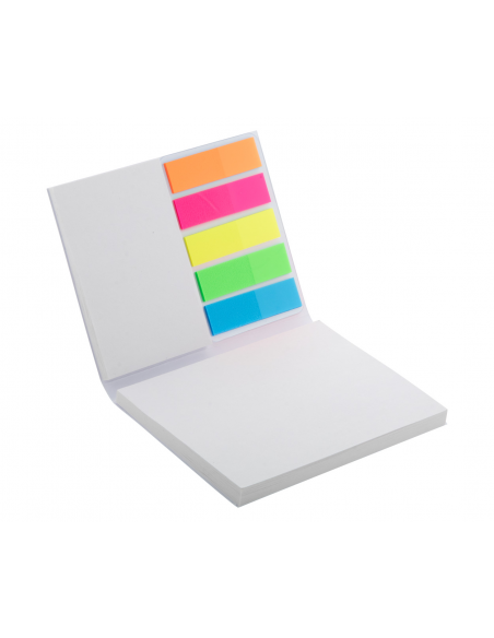 Custom made, paper covered sticky notepad. Includes recycled paper sticky notes in 2 sizes (50 sheets of 100×75 mm, 25 sheets of 50×75 mm) and 100 plastic film page markers in 5 assorted colours (12×44 mm). Price includes full colour printed outside cover. MOQ: 100 pcs.