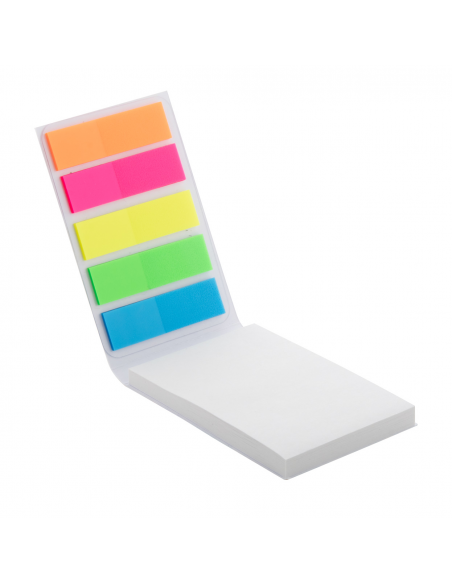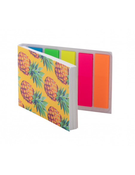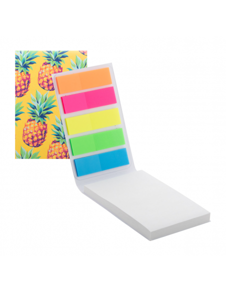 Custom made, paper covered sticky notepad. Includes 50 sheets of recycled paper sticky notes (50×75 mm) and 100 plastic film page markers in 5 assorted colours (44×12 mm). Price includes full colour printed outside cover. MOQ: 100 pcs.