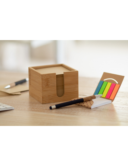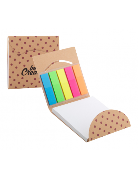 Custom made, recycled kraft paper covered sticky notepad. Includes 50 sheets of recycled paper sticky notes (75×75 mm) and 100 plastic film page markers in 5 assorted colours (44×12 mm). Price includes full colour printed outside cover. MOQ: 100 pcs.