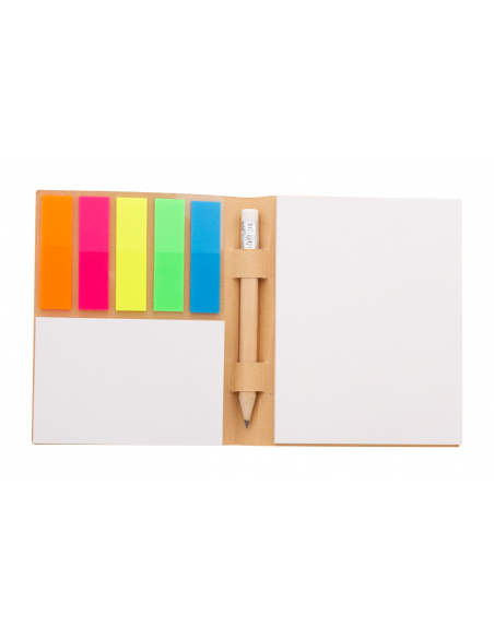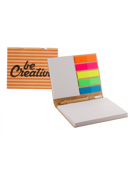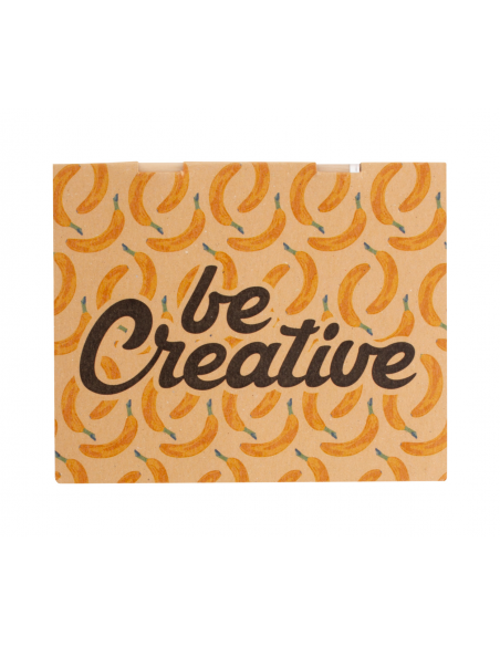 Notepad in holder made of recycled materials: combination of wheat straw and PP, containing 125 leaf shaped sheets. Including a wooden ballpoint pen with plastic leaf decoration on top, with blue refill. Delivered in recycled cardbord gift box.