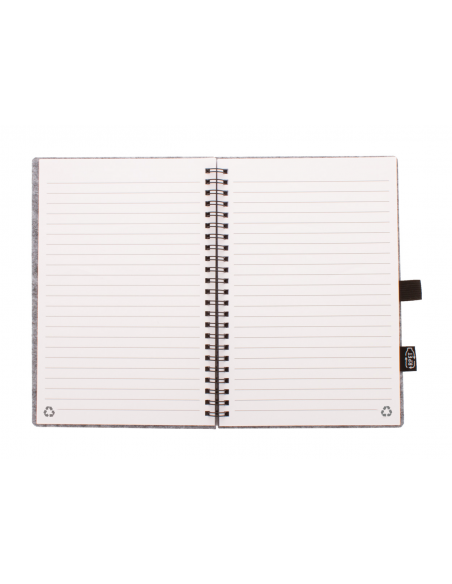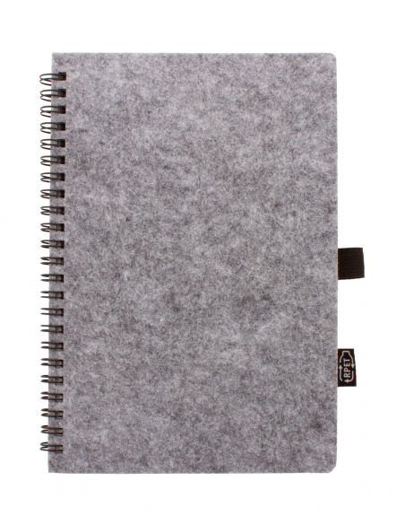 RPET felt covered spiral notebook with distinctive RPET label and 80 lined sheets in recycled paper. A5 size.