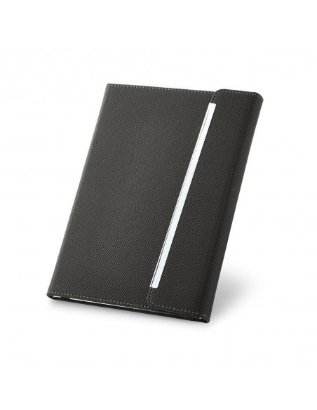 A5 notepad in imitation leather, hardcover and magnetic closure. This notepad has a pen holder (pen not included), 192 plain ivory pages ad bookmark ribbon. Supplied in a non-woven pouch. 148 x 210 mm | Pouch: 185 x 240 mm