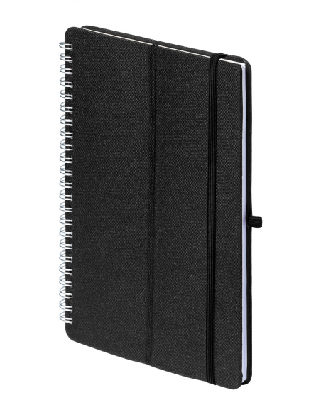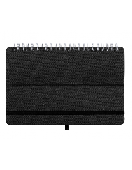 600D RPET polyester covered spiral notebook with wheat straw plastic mobile and table holder insert. With 70 lined sheets and rubber strap. A5 size.