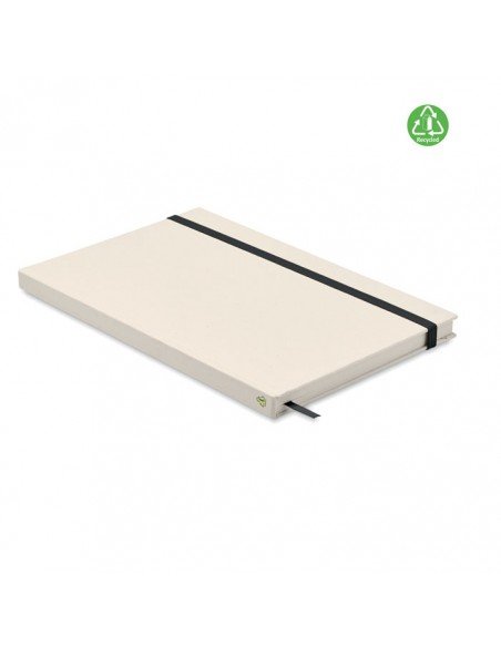 A5 notebook with hard cover made of 70% recycled milk carton pack and 30% recycled paper. Casebound. 160 lined pages (80 sheets 80 gsm) made of recycled paper. Elastic closure strap, ribbon bookmark.