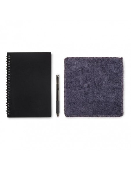 A5 Reusable notebook in PP cover. 36 lined pages (18 sheets). Compatible with any document scanning app. Including water-erasable pen and cleaning cloth.