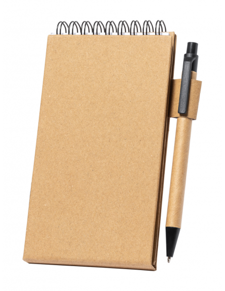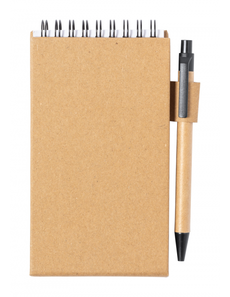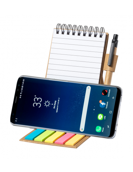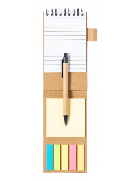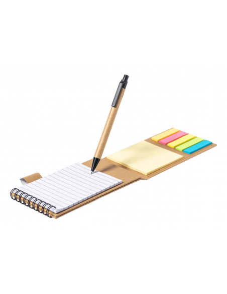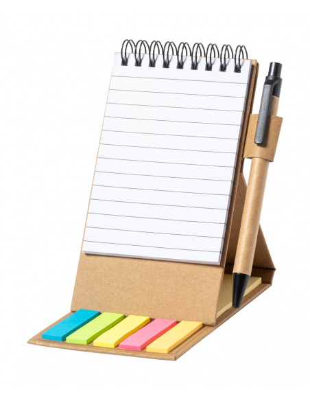 Recycled paper covered spiral notepad with 30 lined sheets, 25 sticky notes and 125 page markers (in 5 different colours). With mobile phone holder function. Including recycled paper ballpoint pen with blue refill.