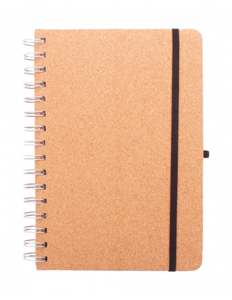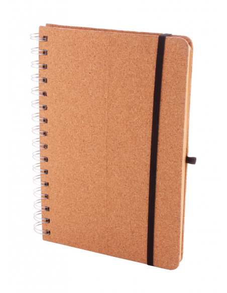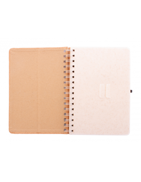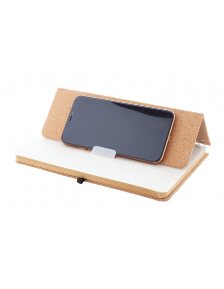 Natural cork covered spiral notebook with wheat straw plastic mobile and tablet holder insert. With 70 lined sheets in recycled kraft paper, rubber strap and pen holder. A5 size.