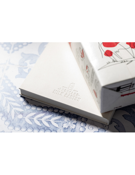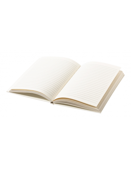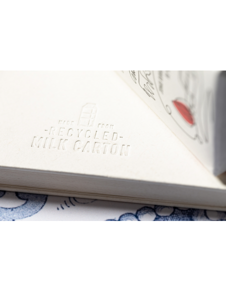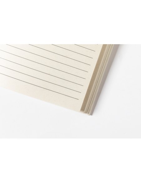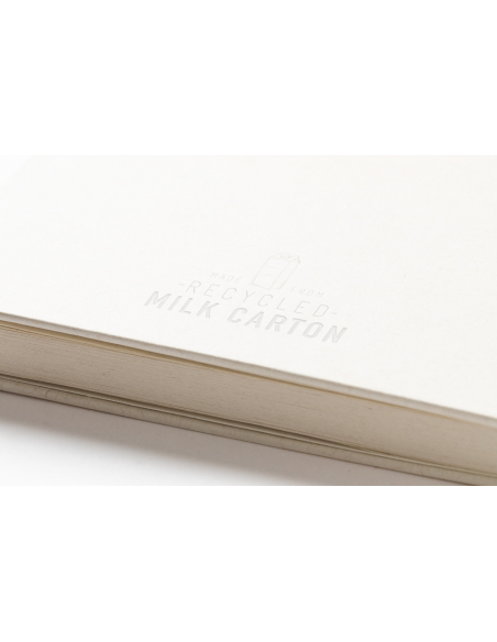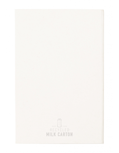 Recycled paper notebook with rigid paper cover from recycled milk cartons and 100 lined sheets.