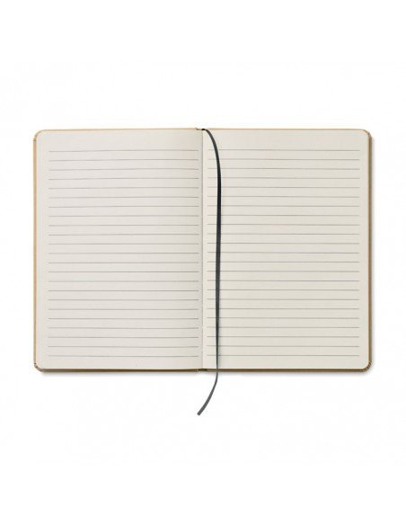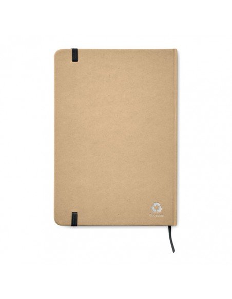 Recycled cardboard covered notebook with 60 blank sheets and coloured rubber strap, A5 size. Including wheat straw plastic ballpoint pen with blue refill.