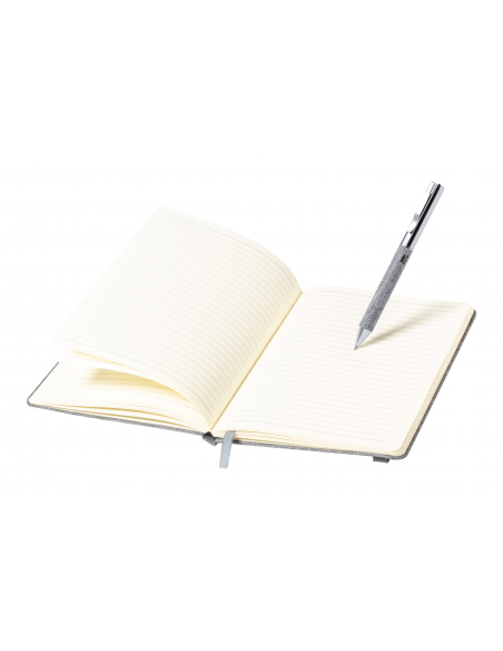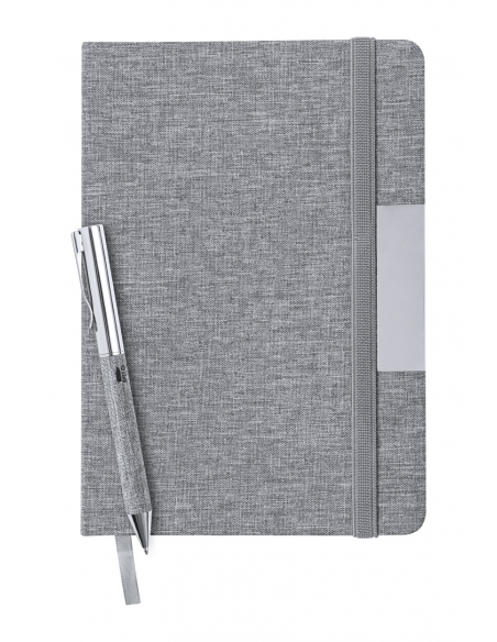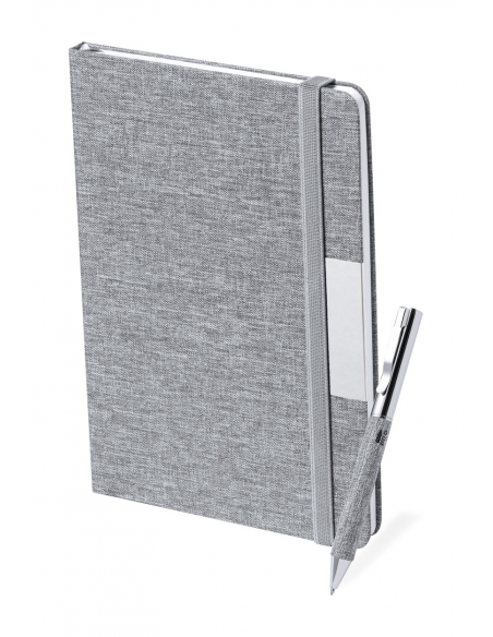 300D RPET polyester covered notebook with 100 lined sheets and rubber strap. Including an RPET polyester covered metal ballpoint pen, with blue refill. A5 size.