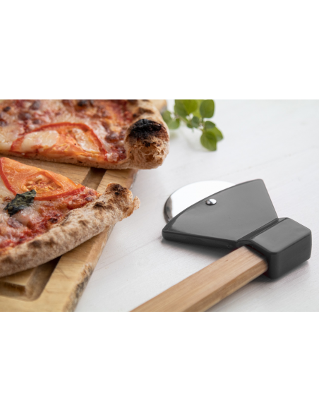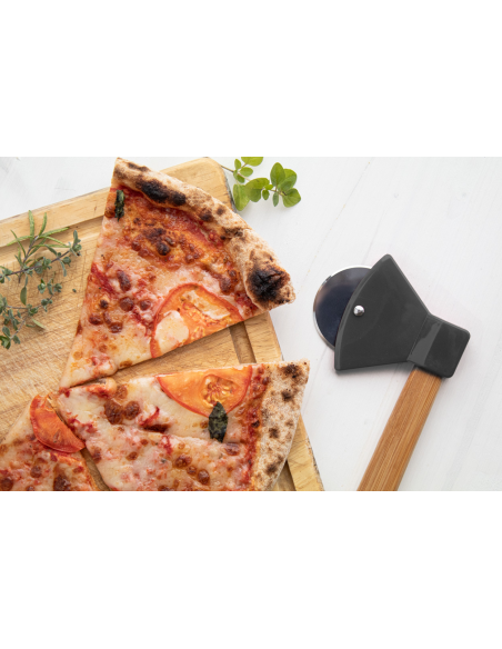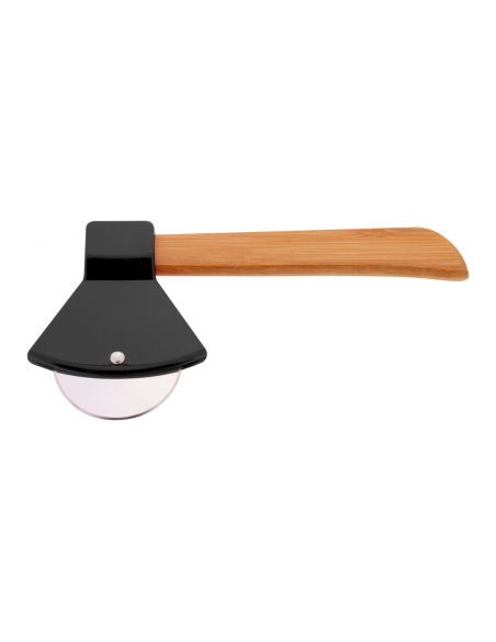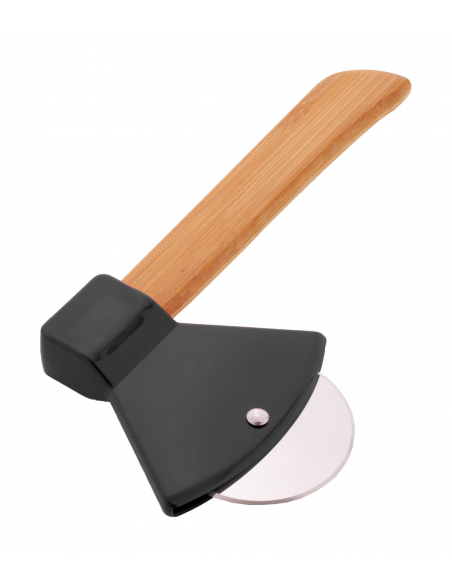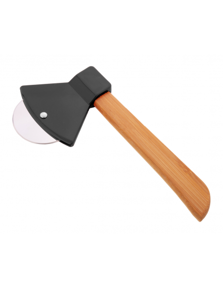 Axe shaped pizza cutter with bamboo handle and stainless steel blade.