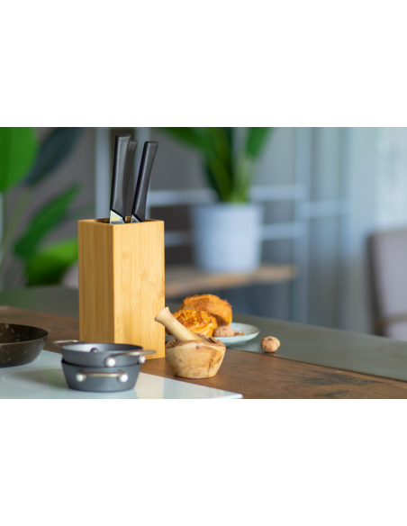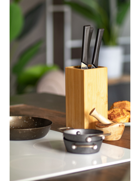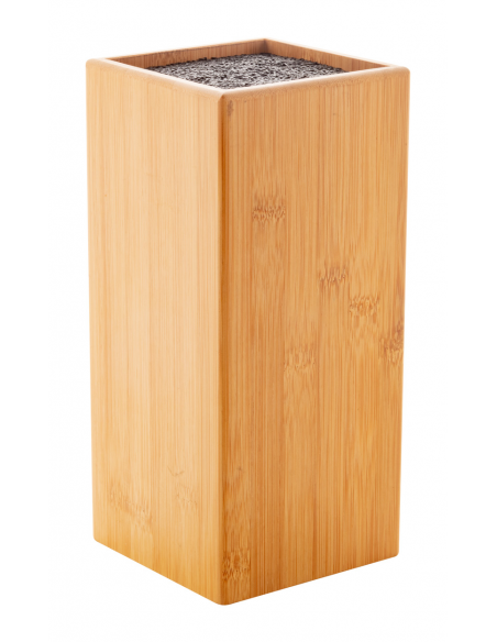 Universal bamboo knife block with plastic bristles.