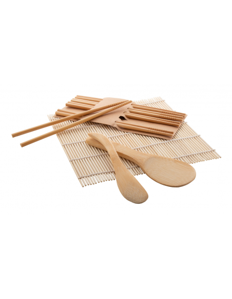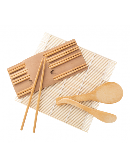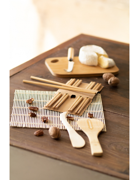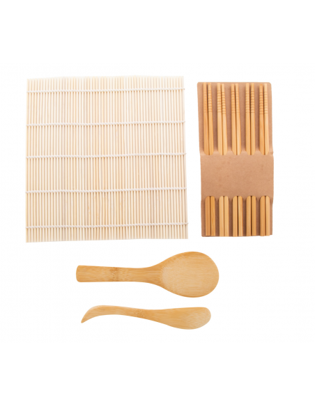 Bamboo sushi making set with bamboo sushi mat, rice paddle, rice spreader and 5 pairs of chopsticks. In kraft paper box.